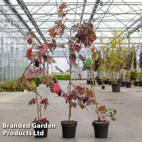 Racemes of green flowers in summer are followed by an autumn crop of small fruits. Due to their thicker skins and pips they are not the best choice for eating straight from the vine, however they do make excellent jellies and juice. Also a great choice for adding to autumn flower arrangements and table displays! Height of cordon trained vine: 1.8m (6′). Spread of cordon trained vine: 1.5m (5′). Untrained plants may reach up to 8m (26′).