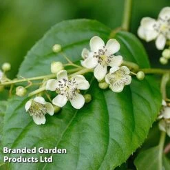The perfect match for ‘Pink Jumbo’, ‘Prince Jumbo’ is a non-fruiting vigorous male clone that serves as an indispensable pollinator for all Actinidia arguta varieties. Creamy-white flowers are produced prolifically and reliably in June on a fast-growing vine which can easily be kept compact with pruning. Height and spread: up to 8 metres (26ft).